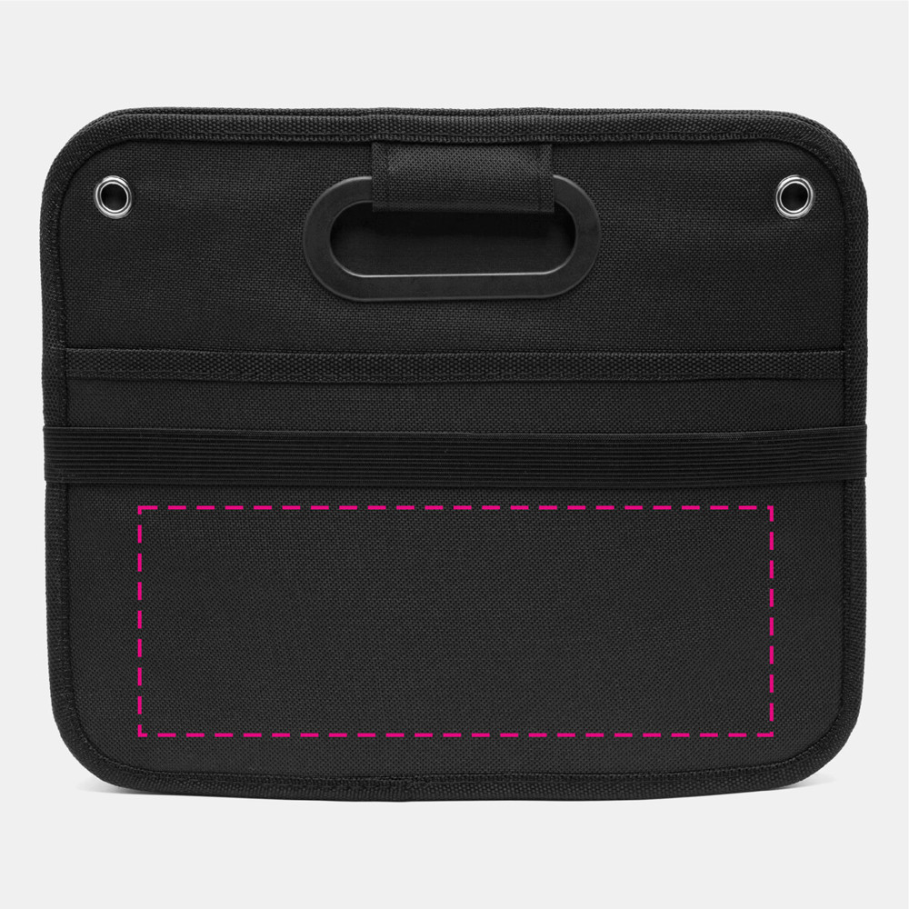 Opvouwbare auto kofferbaktas CAR-GADGET met 2 ruime vakken en een insteekvak, 2 geïntegreerde handgrepen, klittenband aan de onderzijde voor stevige grip, 4 metalen bevestigingsogen en een elastische riem voor het opvouwen van de tas.