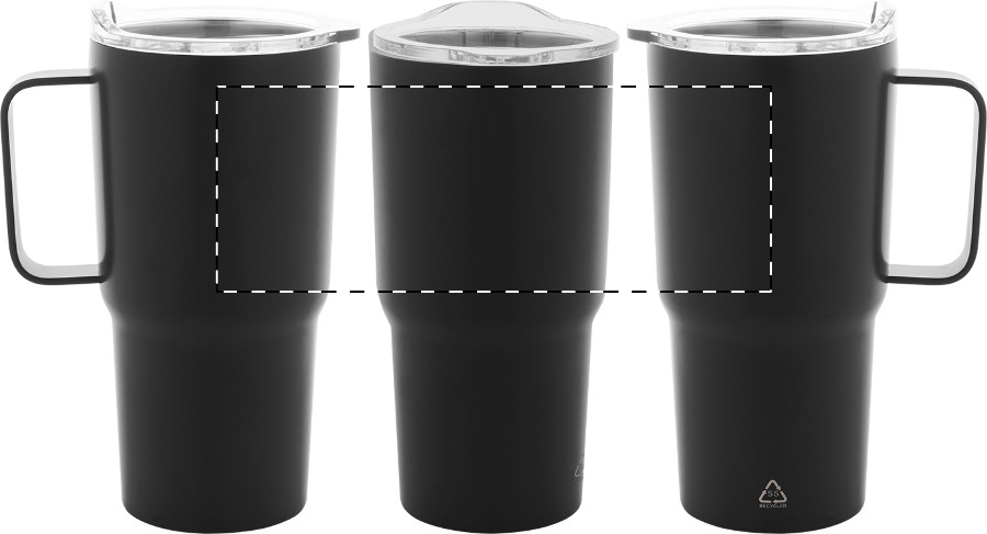 Dubbelwandige, gerecyclede roestvrijstalen vacuümgeïsoleerde thermomok met drinkdeksel van PS-kunststof. 600 ml.